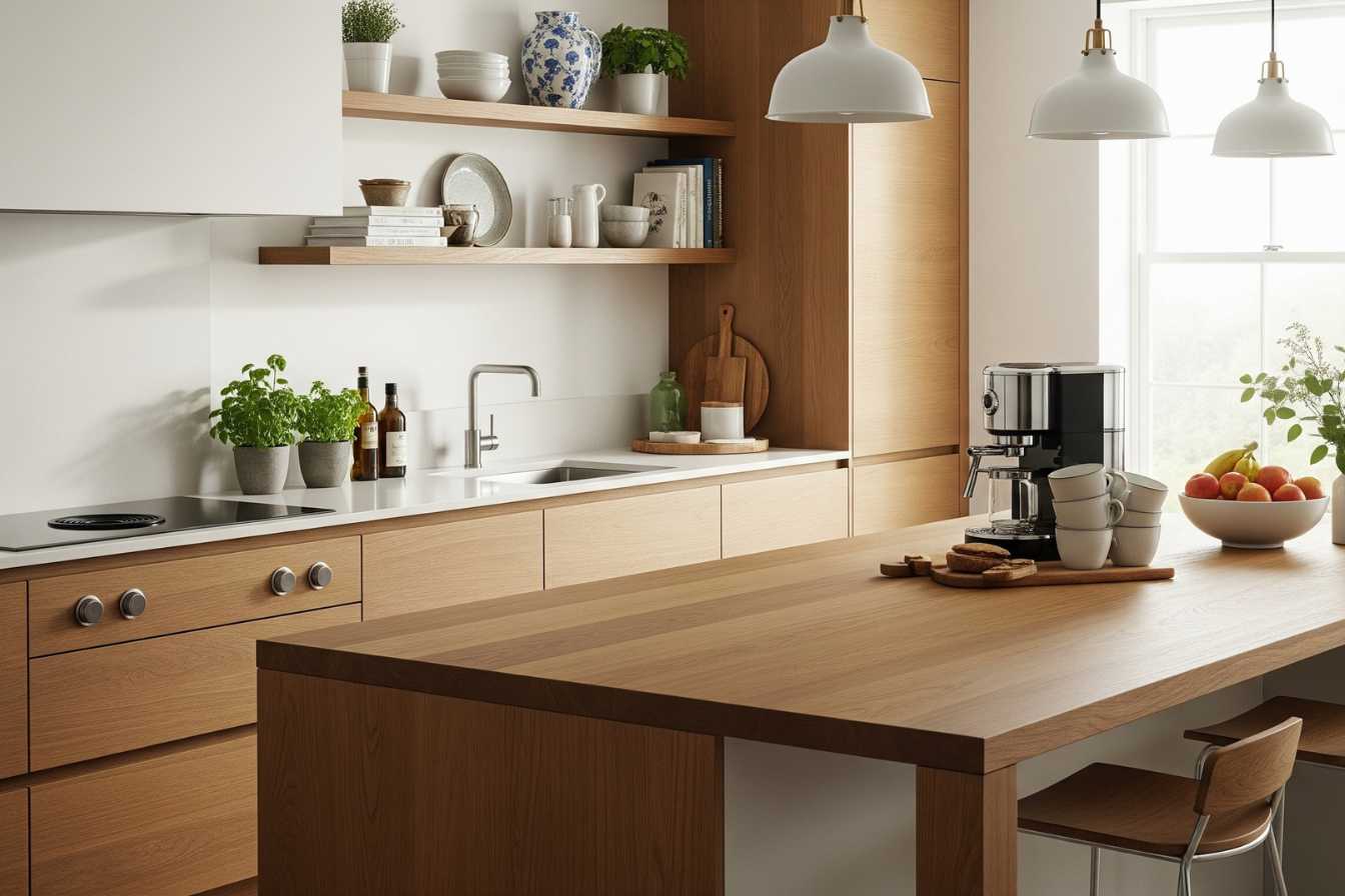 Le style scandinave connaît également un succès considérable. Il combine bois clair (façades effet chêne blanchi ou bouleau), blanc immaculé et touches de couleurs douces. Cette approche crée une atmosphère chaleureuse et accueillante sans nécessiter de matériaux coûteux. L’ajout de quelques accessoires en bois naturel et de plantes vertes suffit à parfaire l’ambiance nordique.